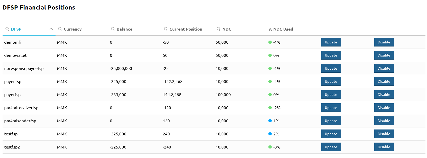 To access the DFSP Financial Positions page, go to Participants > DFSP Financial Positions.