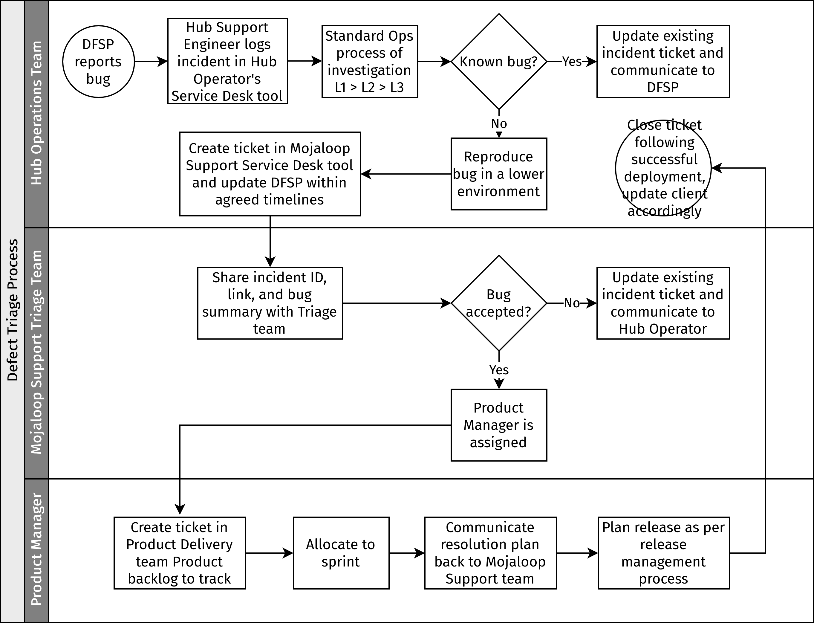 - The Mojaloop Support ticket is closed once the bug fix release is deployed and validated in the Hub Operator's environment.
