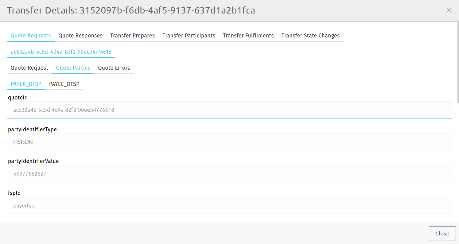 The Quote Parties sub-tab displays the following details about the Payer DFSP and Payee DFSP: