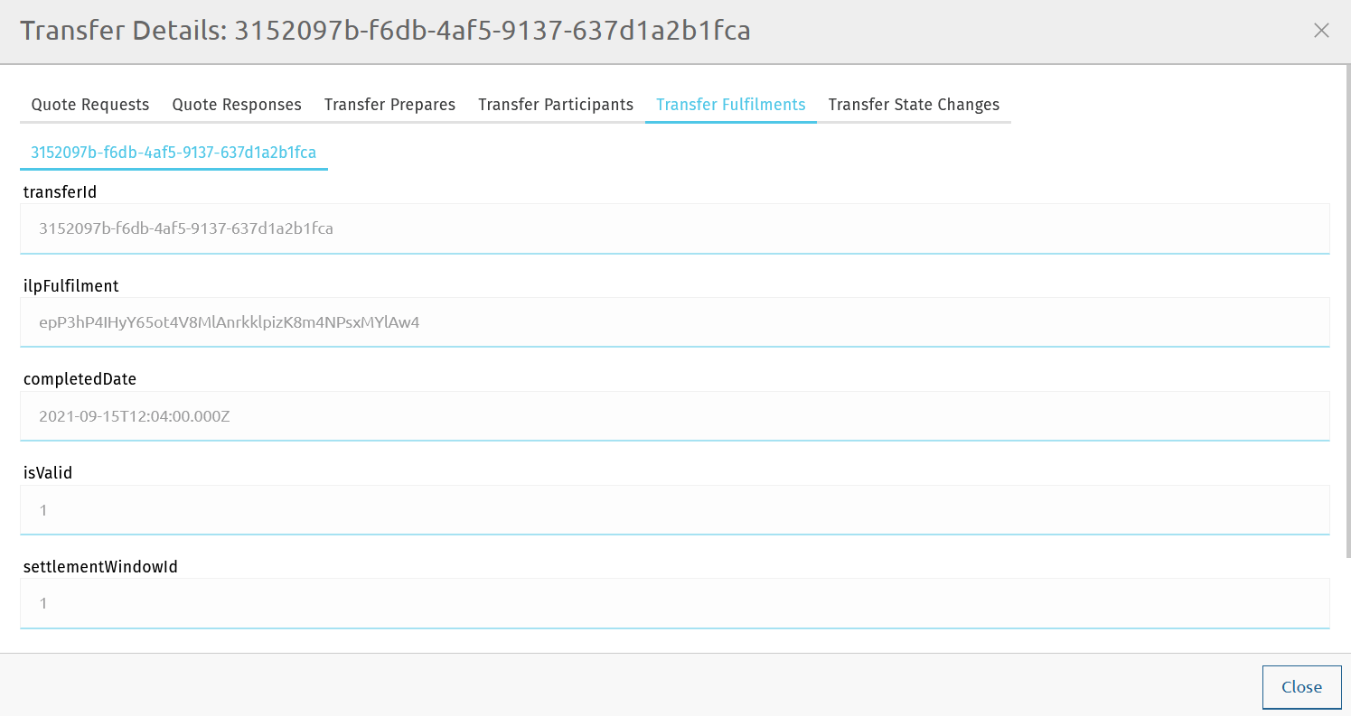 The Transfer Fulfilments tab displays the following details about the transfer response:
