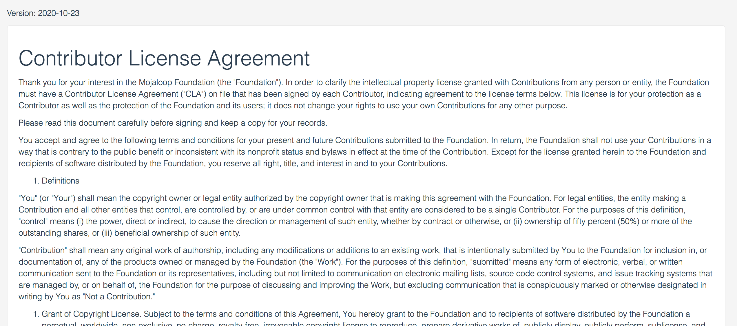 Mojaloop has a Contributor License Agreement (CLA) (opens new window) which clarifies the intellectual property rights for contributions from individuals or entities.
